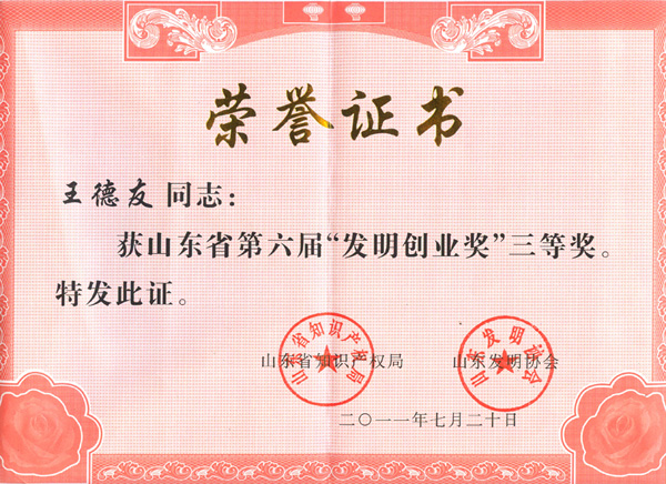 近日,從山東省知識產(chǎn)權(quán)局傳來喜訊(魯發(fā)協(xié)[2011]8號),集團總裁王德友喜獲山東省第六屆發(fā)明創(chuàng)業(yè)三等獎。