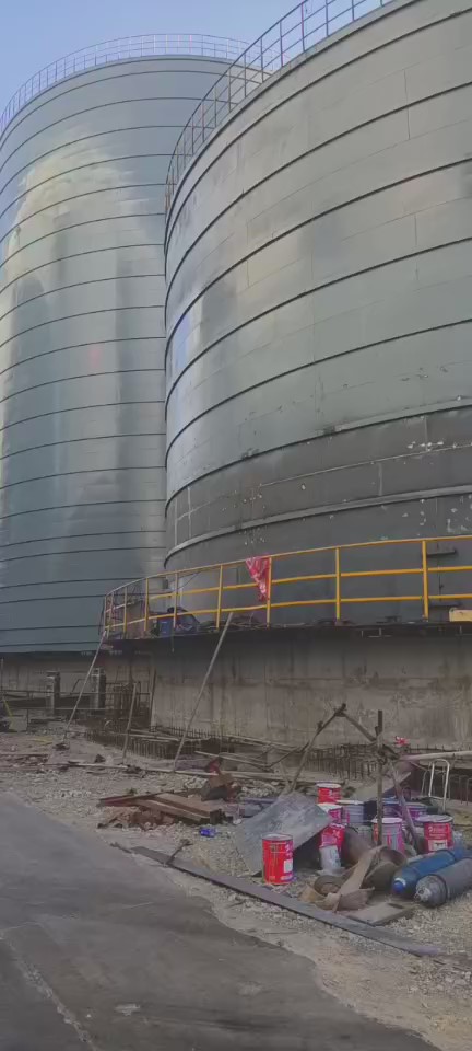 圖為我公司在新疆工地的施工現(xiàn)場,制作安裝的三座直徑23米,高32.3米石油焦鋼板倉,用的是焊接式鋼板倉。