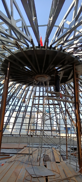 倉體采用的8mm-18mm鋼板,倉頂采用的是5mm厚鋼板,倉頂結(jié)構(gòu)采用的是桁架結(jié)構(gòu)。